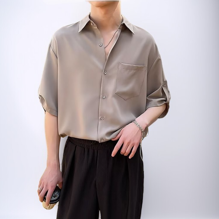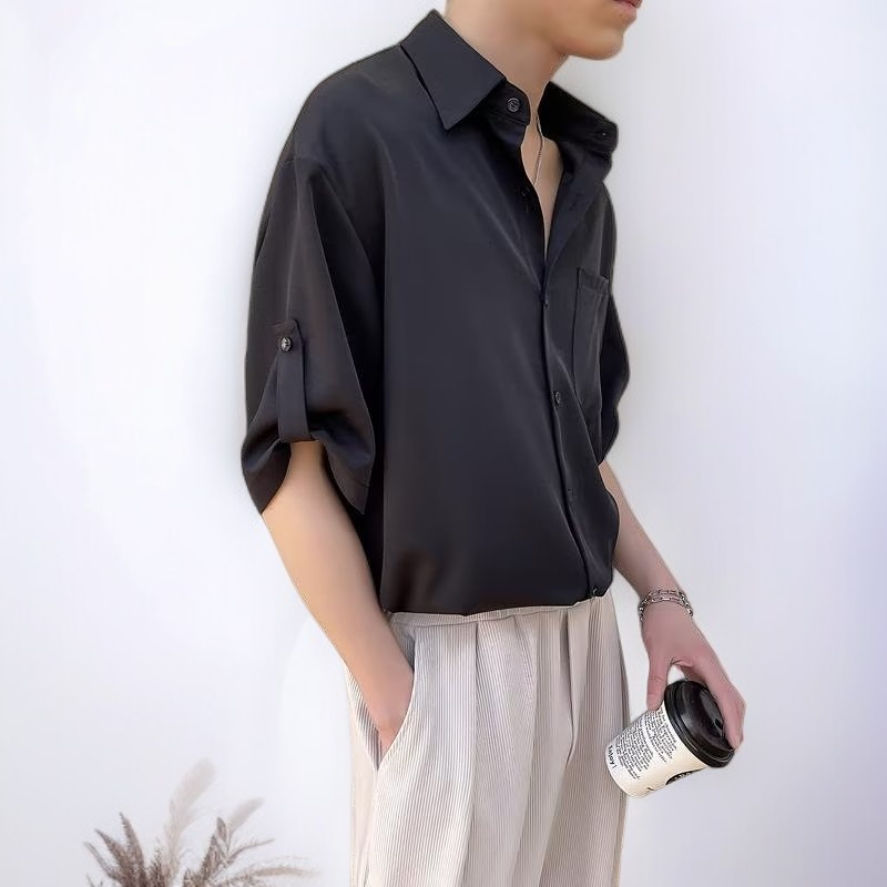 ビジネスダークグリーンメンズ半袖シャツノンアイロンルーズシャツドレープ半袖シャツ